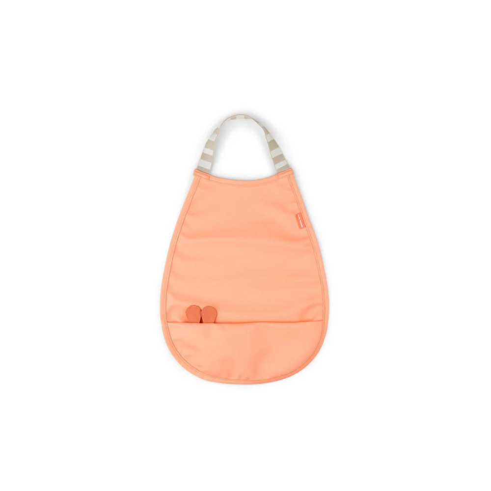 Ce joli bavoir corail a les douces oreilles de Raffi la girafe qui sortent de la poche, et un élastique rayé.
