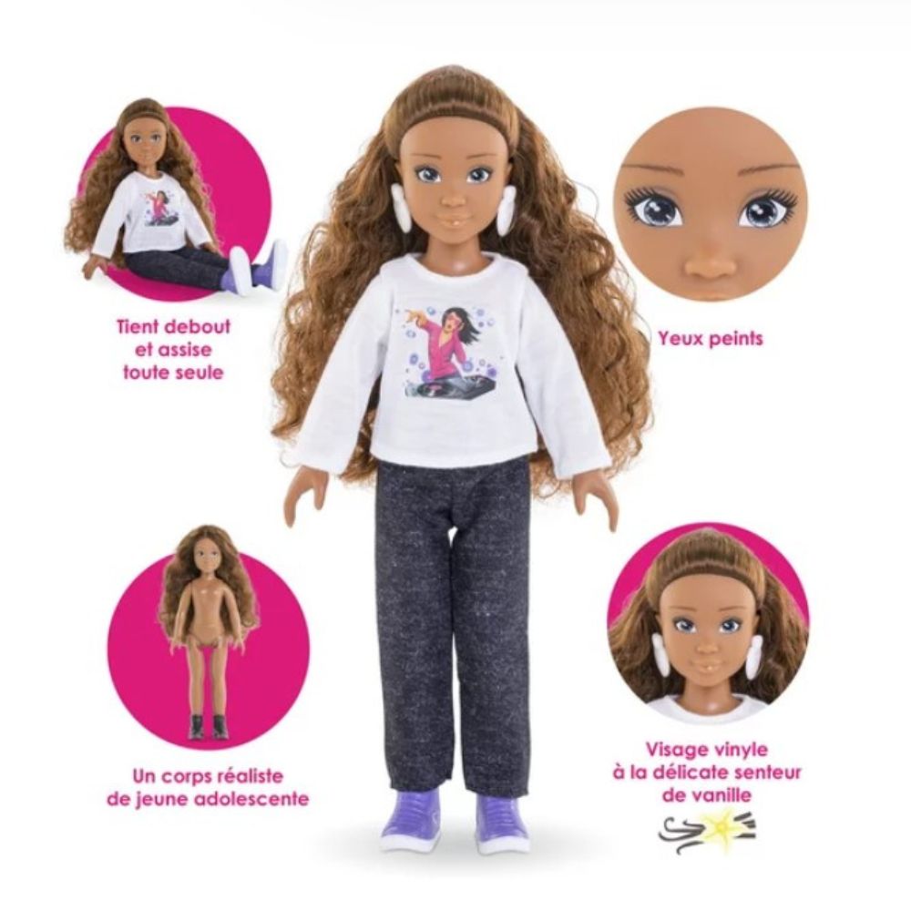 Poupée mannequin de 28 cm. Visage en vinyle qui sent bon la vanille. Yeux peints. Corps réaliste de jeune adolescente, tient assise et debout toute seule. Dès 4 ans.