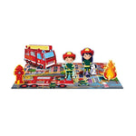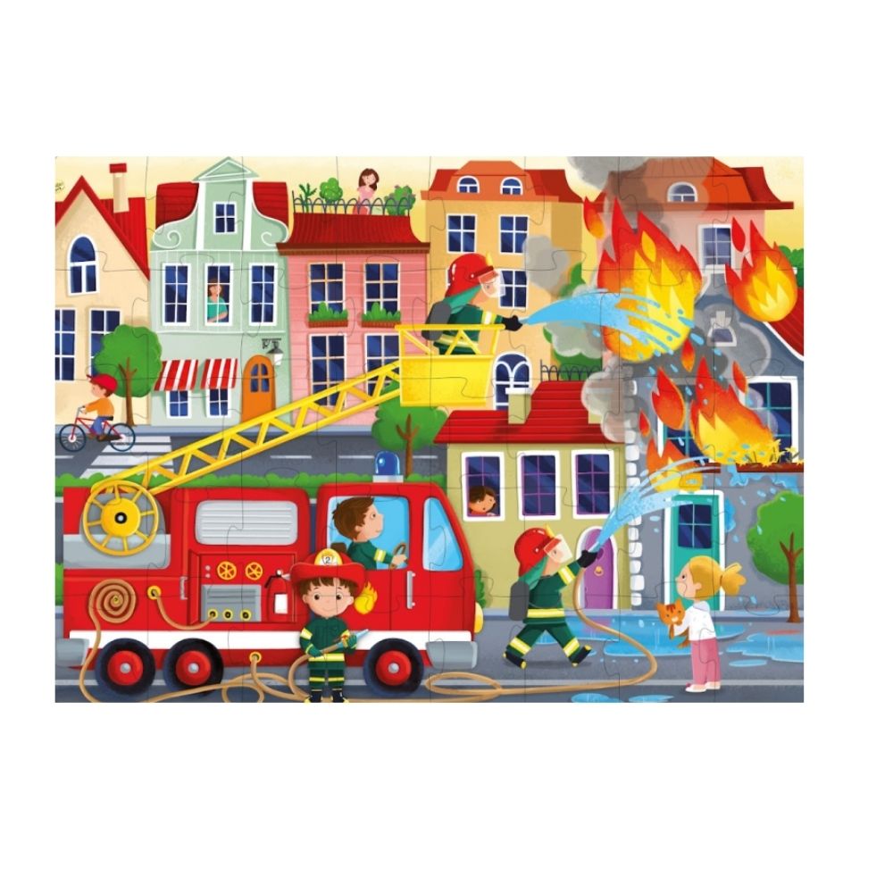 Une boîte contenant un livre de 10 pages, un puzzle de 40 pièces, 4 figurines à assembler et à placer sur le puzzle et un camion de pompier à construire, pour apprendre à reconnaître et à associer des éléments et des mots.