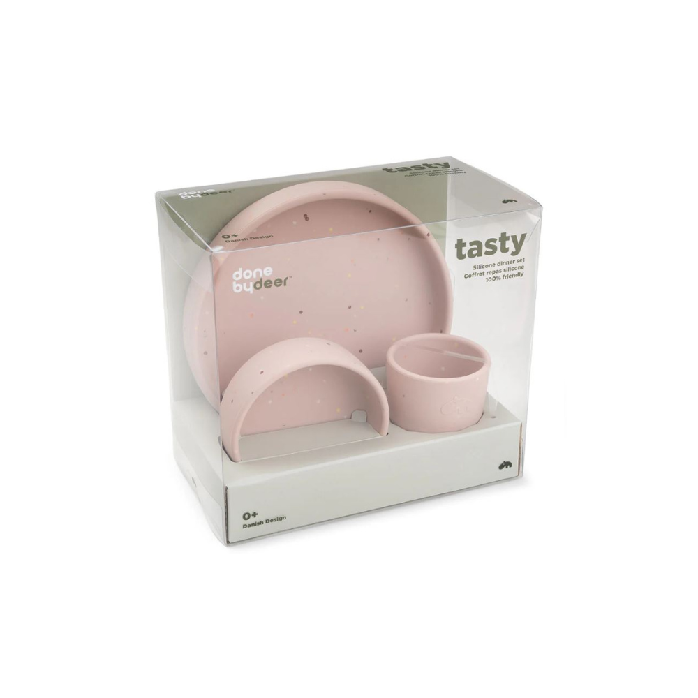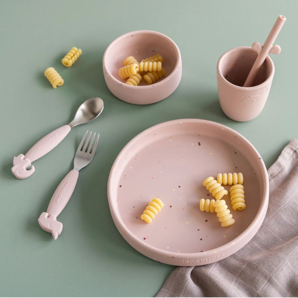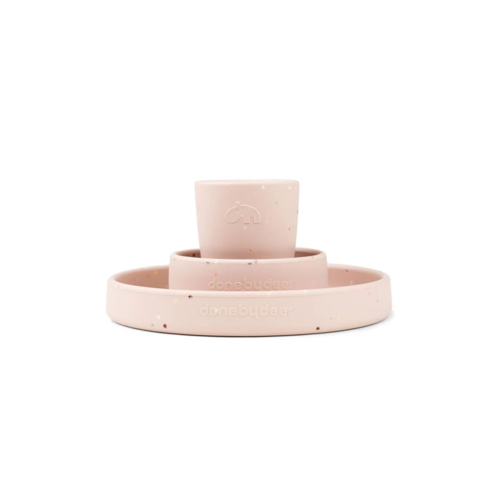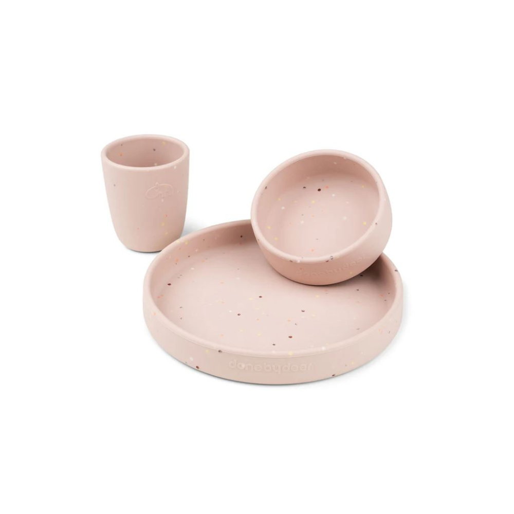 Découvrez l'ensemble de repas aux couleurs douces de la marque Done By Deer, parfait pour les petites célébrations ! Cet ensemble comprend une assiette, un bol et un mini gobelet, tous ornés de confettis qui ravira vos petits gourmets.