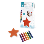 Le coloriage de bain contient : 6 crayons de couleur et une éponge en forme d'étoile de mer.