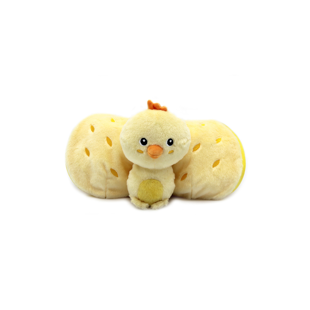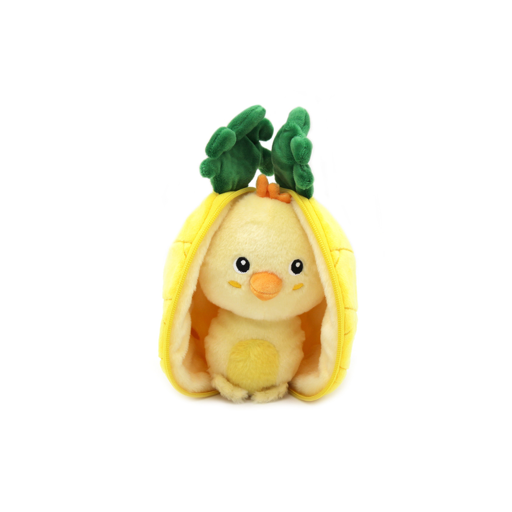 Le doudou poussin se distingue par ses ailes en forme d'ananas, qui se ferment grâce à une astucieuse fermeture éclair. Cette fonctionnalité ludique stimule l’imagination de votre enfant en lui permettant de jouer à cache-cache avec son petit poussin.
