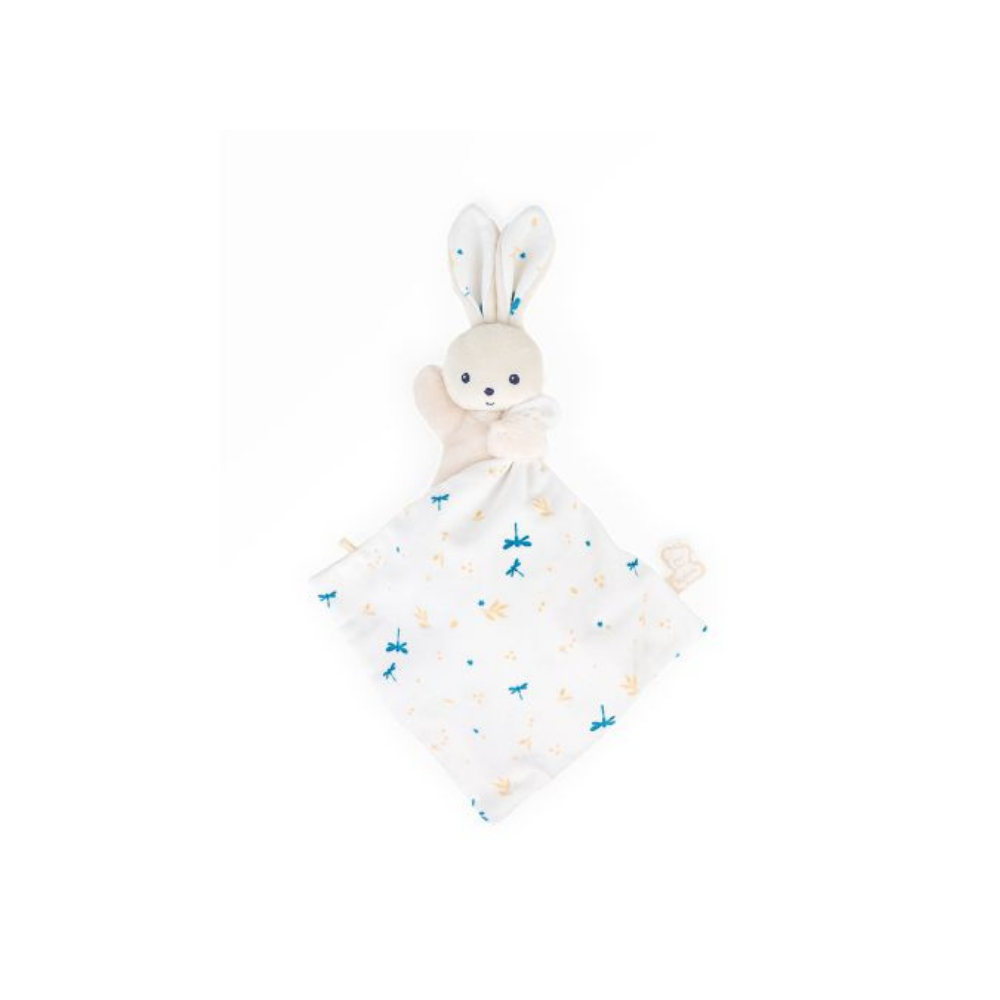 Le doudou plat blanc est habillé de petites libellules qui virevoltent entre les brindilles dorées. Cet imprimé délicat et poétique se retrouve également dans les oreilles du lapin.