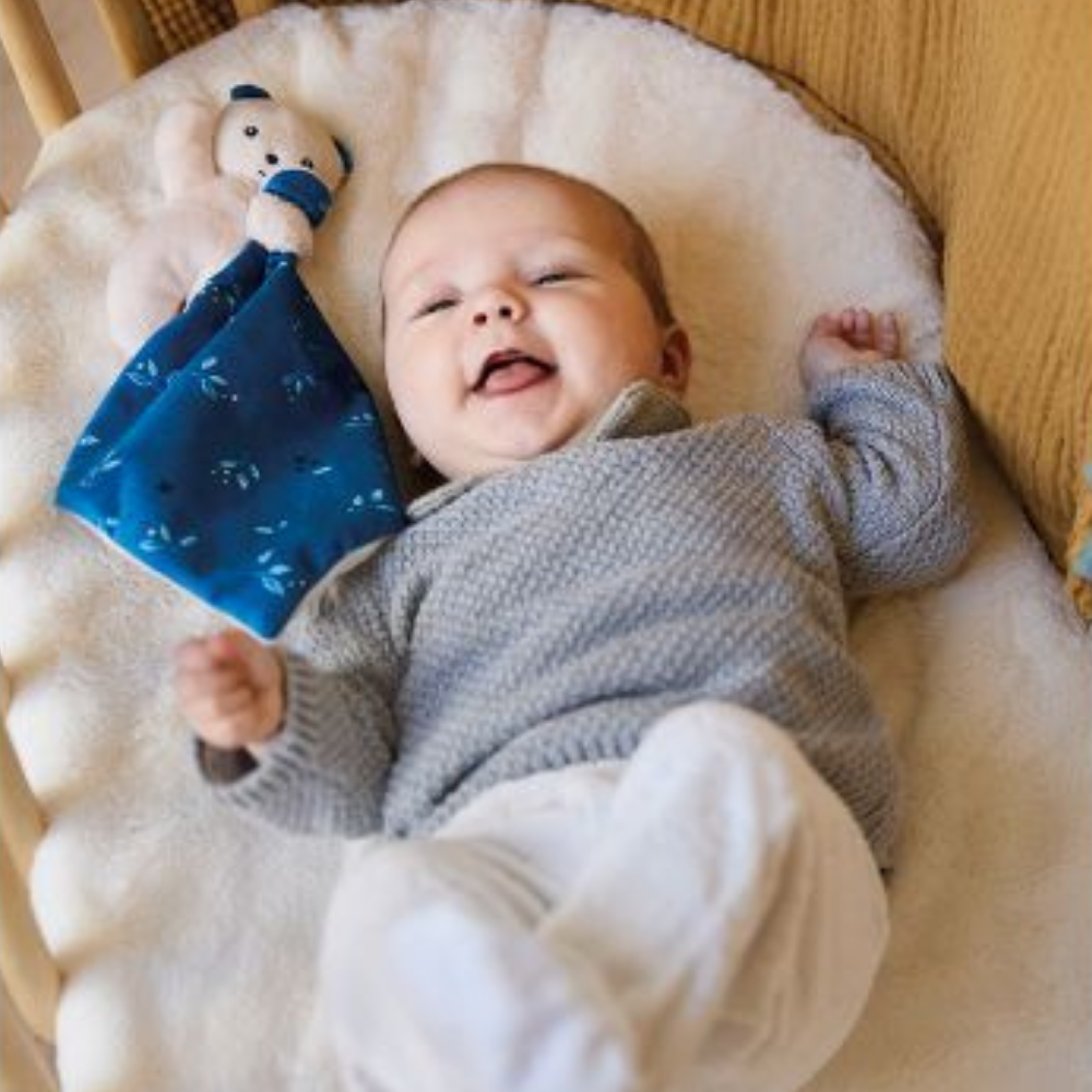 Avec son petit corps moelleux en micro-velours, l'ourson est facile à agripper et à tenir. Le doudou plat bleu entre ses mains est habillé d'un motif Noctambule. Cet imprimé délicat et poétique se retrouve également dans les oreilles de l'ours.
