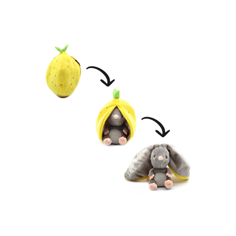 Le doudou souris se distingue par ses oreilles en forme de citrons, qui se ferment grâce à une astucieuse fermeture éclair. Cette fonctionnalité ludique stimule l’imagination de votre enfant en lui permettant de jouer à cache-cache avec sa petite souris.