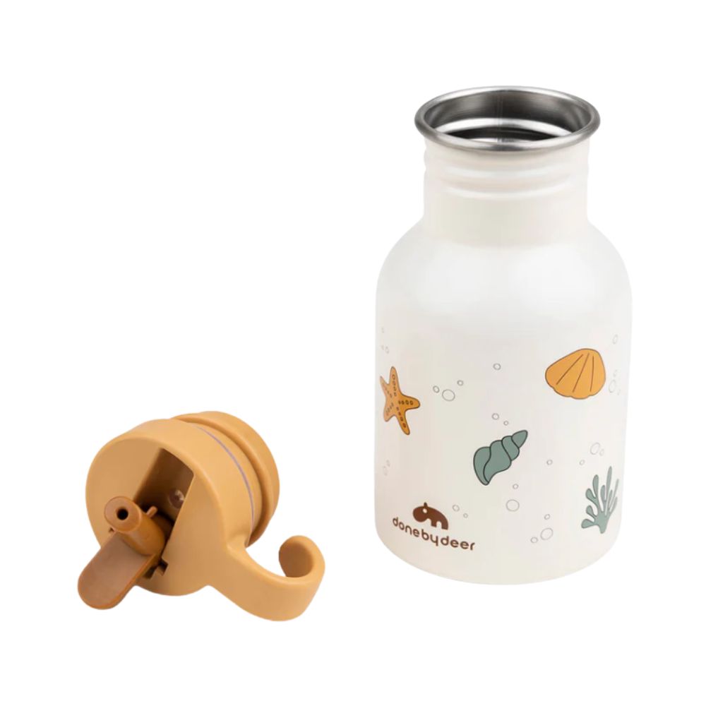 La gourde métallique est aux tons beige sable, décorée du curieux Jelly et du puissant Wally, passant devant des coquillages, des récifs coralliens et des étoiles de mer.