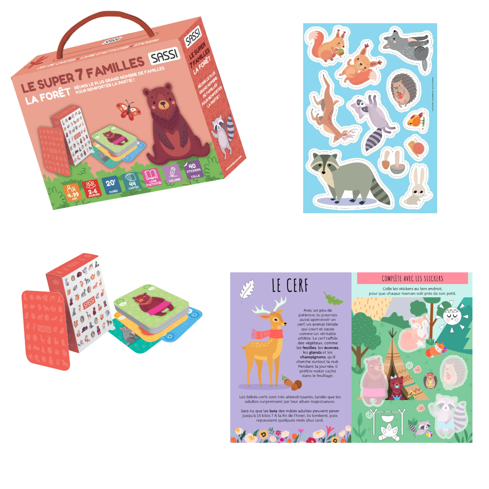 Le célèbre jeu des 7 familles présenté dans une version parfaite pour les petits et dans une variante encore plus amusante ! 44 cartes à jouer illustrées d'animaux de la forêt et rassemblées dans un étui pratique, accompagnées d'un livre de 16 pages rempli d'activités et de 40 autocollants.