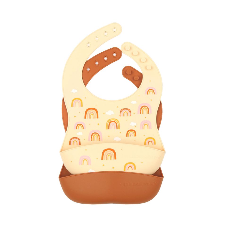 Ensemble de deux bavoirs en silicone, l'un avec un motif arc-en-ciel et l'autre dans une version unie complémentaire.