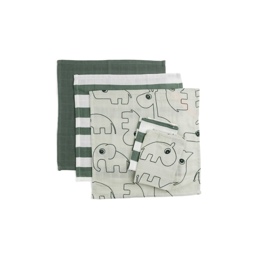 Optez pour ce pack de 5 lingettes en coton 100% biologique de la marque Done By Deer, pratiques dans un mélange de couleurs unies, de rayures et de jolis motifs d'animaux.