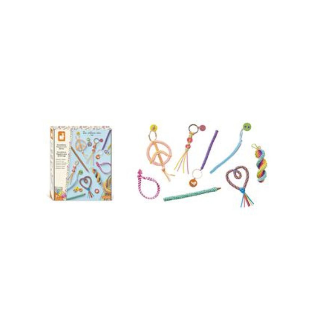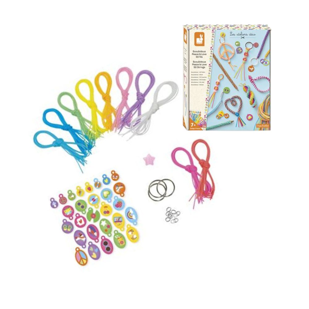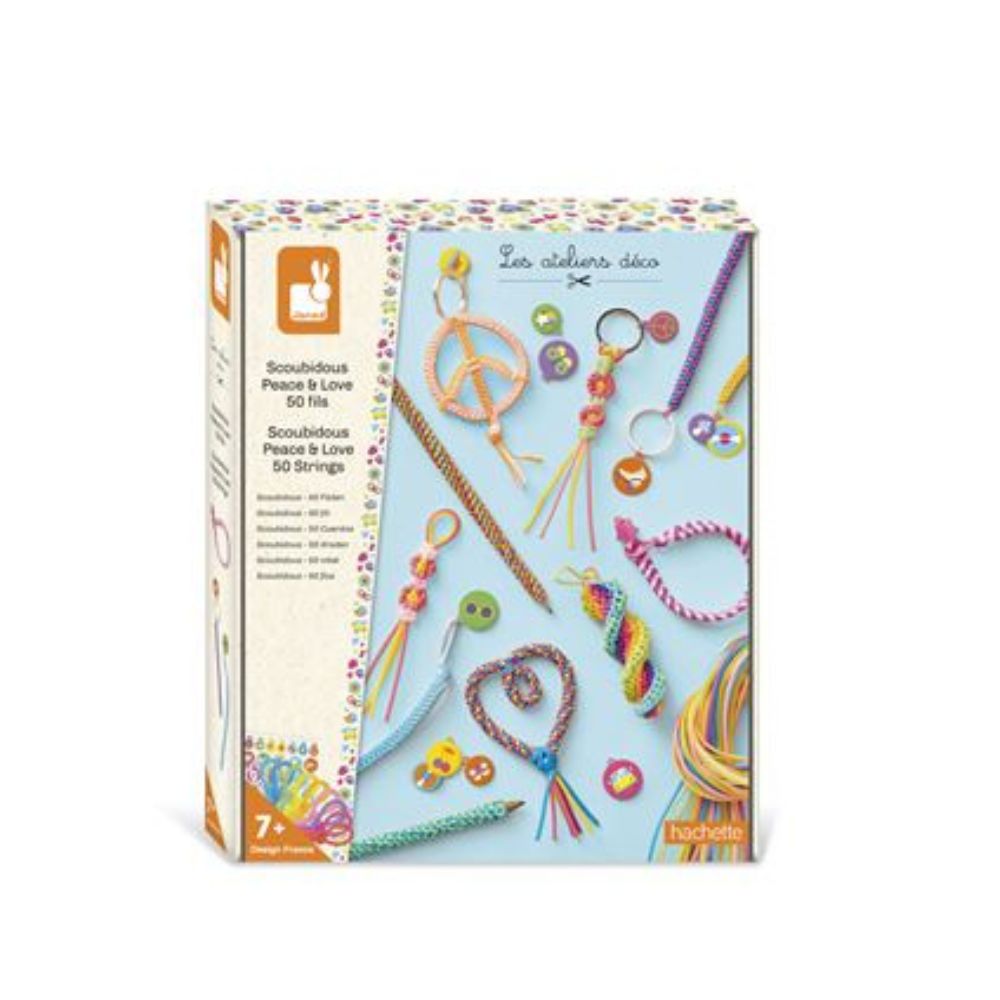 Scoubidoubidous ! Ce coffret créatif permet de réaliser 8 modèles différents avec des niveaux de difficultés évolutifs, autour d'une thématique Peace & Love.